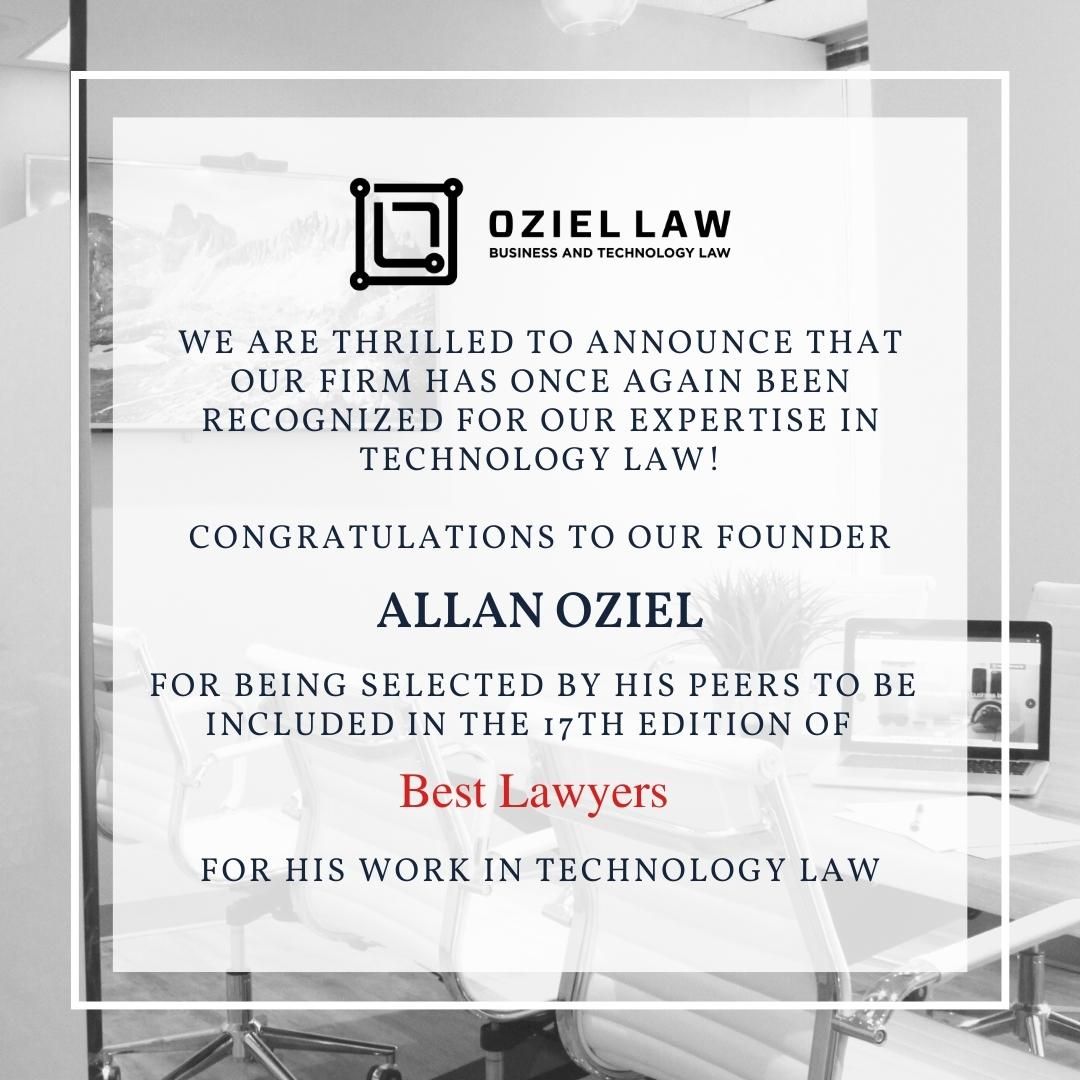 We are proud to announce that our firm has once again been recognized for its expertise in Technology Law. Congratulations to our founder, Allan Oziel, for having been selected by his peers for inclusion in the 17th Edition of Best Lawyers in Canada for his work in Technology Law.