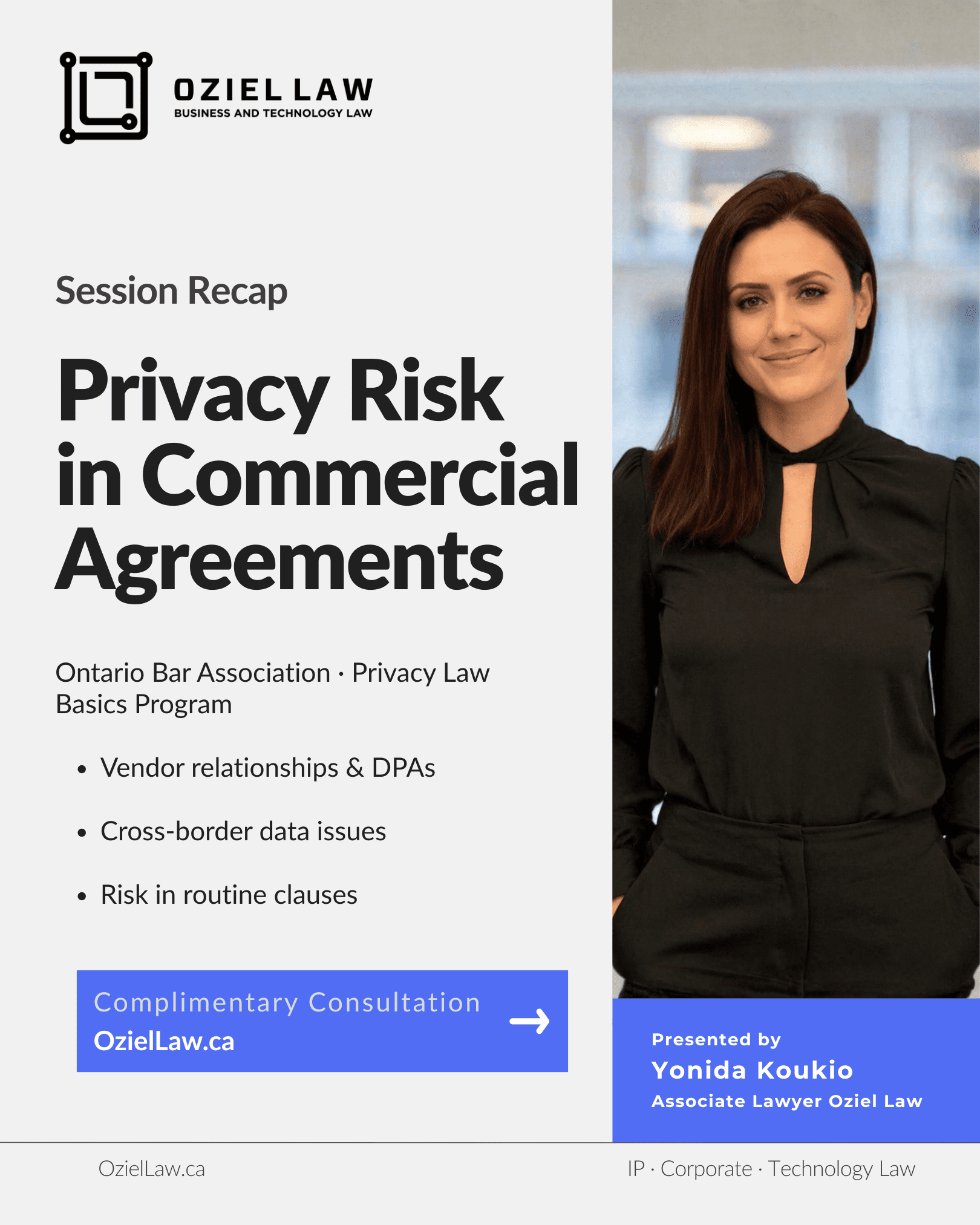 Our Associate, Yonida Koukio, presented at the Ontario Bar Association’s Privacy Law Basics program alongside Paniz Ghazanfari and Ian Duke, bringing together perspectives from both the private and public sectors.